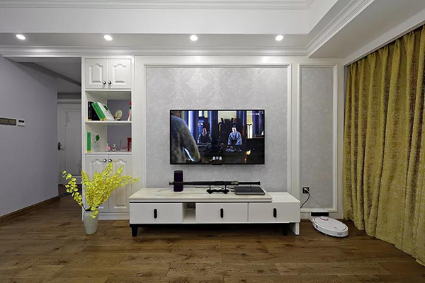 經(jīng)典美式的墻體勾線,淡淡的花紋墻紙,搭配白色電視矮柜,用現(xiàn)代美式家居營造優(yōu)雅的客廳氛圍。