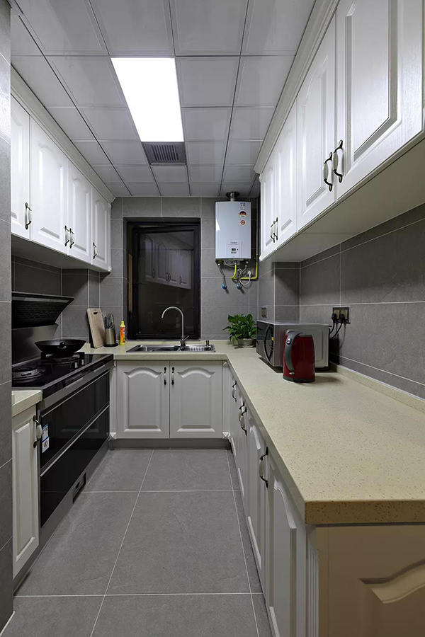 廚房采用了防污、抗腐蝕性能強(qiáng)的吊頂,中間嵌入一塊長條燈具與抽風(fēng)機(jī),十分實用。大理石的操作臺面,易清理又耐用,一般大小的廚房也能把各功能區(qū)分開來。