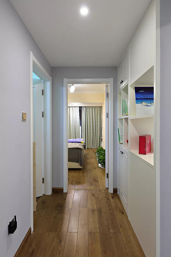 用過道空間做了入墻式的收納柜,既增加室內(nèi)的收納空間,又不妨礙活動空間,結(jié)合復(fù)古木色與白色,讓原本單調(diào)的走廊也顯文藝愜意。
