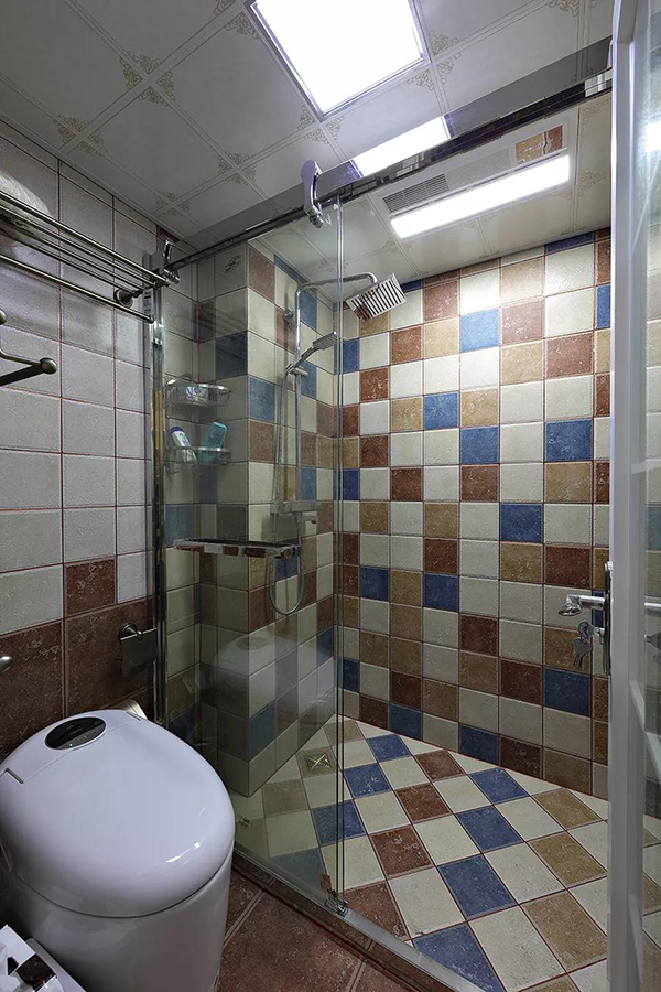 馬賽克瓷磚為淋浴區(qū)增添了田園風(fēng),而玻璃推門則表達(dá)現(xiàn)代時尚感,色彩斑斕的淋浴區(qū),讓業(yè)主在淋浴時悠閑自得。