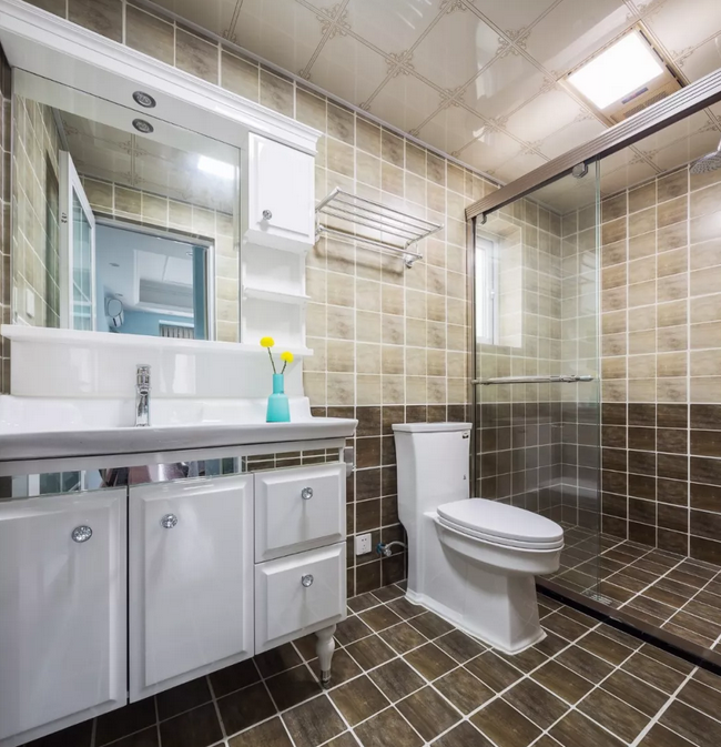 ▲主衛(wèi)的墻面墻面與公用衛(wèi)生間一樣的褐色地磚,顯得復古調滿滿的。