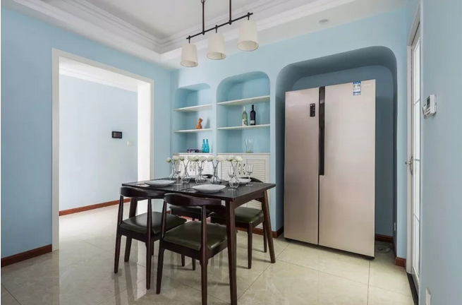 ▲餐廳擺著一套禪意極致的實木餐桌椅,同時餐邊柜是以壁龕入墻的方式安裝,并給冰箱留了一個壁洞,在圓滑的處理下,讓整個空間都顯得簡潔優(yōu)雅而又美觀。