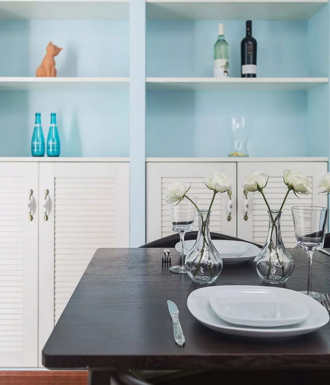 ▲餐邊柜上方的展示架上擺上精致的花瓶,結合餐桌上浪漫情調的插花,讓用餐的空間顯得溫馨感爆棚。