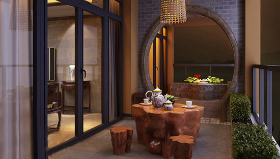 為了充分利用小陽臺的空間,有些人則將其與客廳打通連為一體,再用落地窗與外界離隔,配上瀟灑的窗布。在陽臺放上沙發(fā)、凳椅、花木盆景,仿佛置于戶外欣賞到室外的景象,別有一番情味。