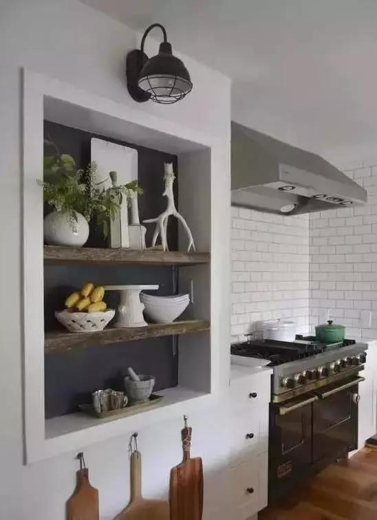 廚房空間的收納是非常重要的而對墻面的利用也十分常見除了置物板、掛桿之外給廚房墻面“打洞”同樣也能擁有收納物品的效果。