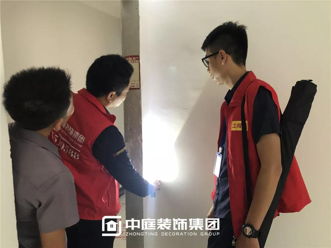 使用強光手電檢查陰角膩子施工打磨情況,工地大巡檢,不放過任何一個角落